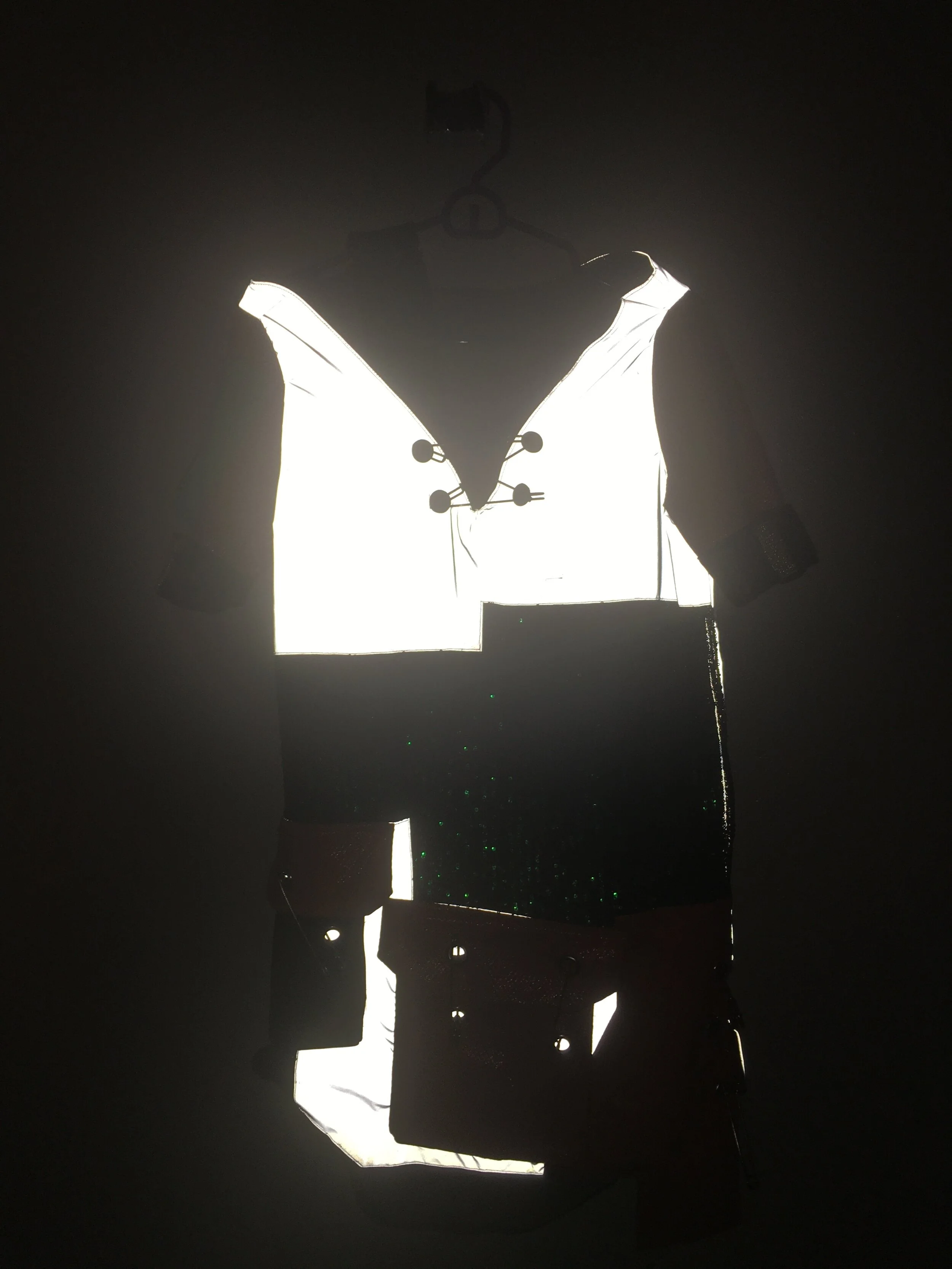 There is no actual technology in this collection, the different fabric layers represent the layers of the robots—human, metal, and tech. These layers are revealed in a patchwork effect to illustrate the breaking down of the robots.