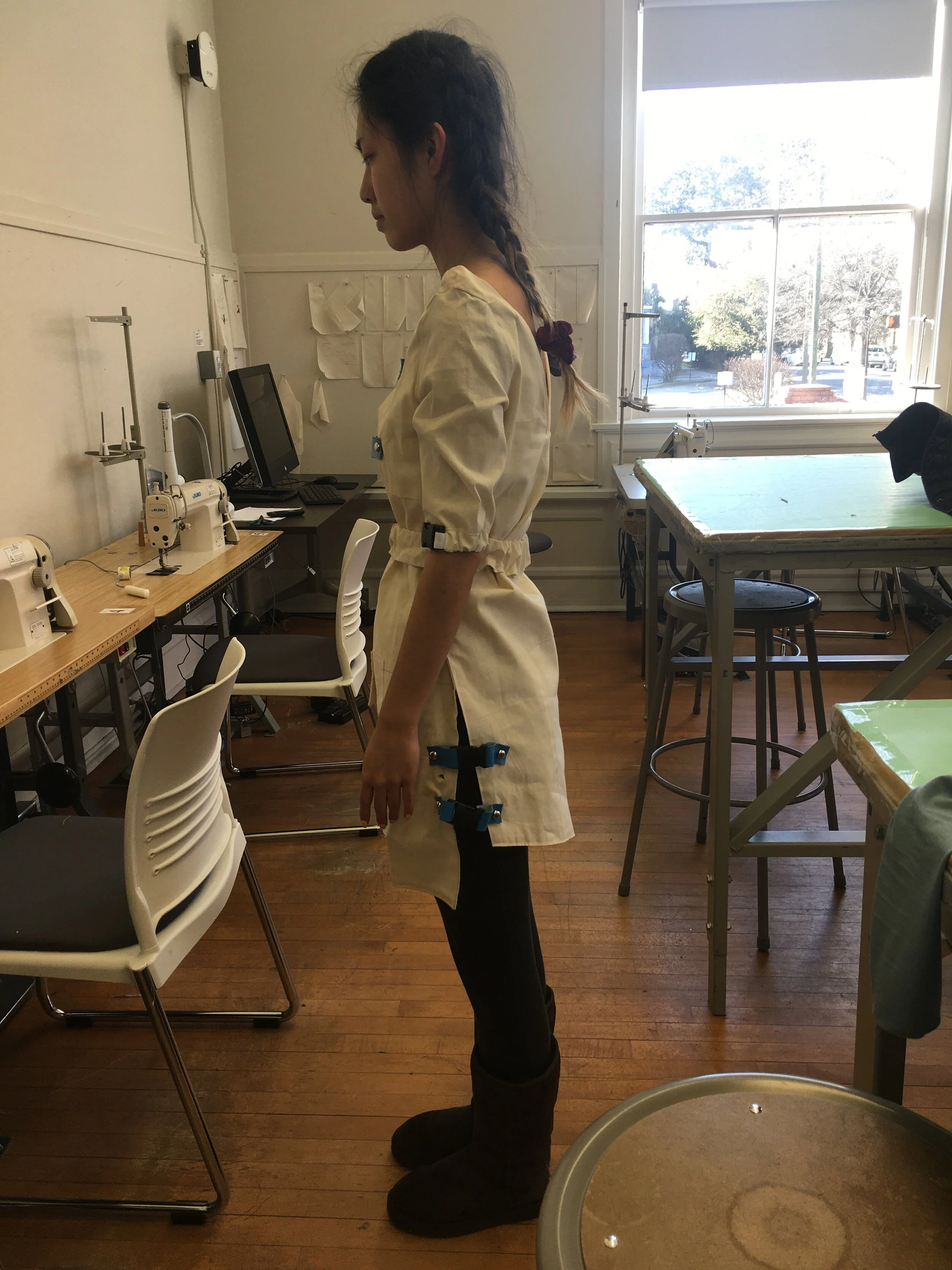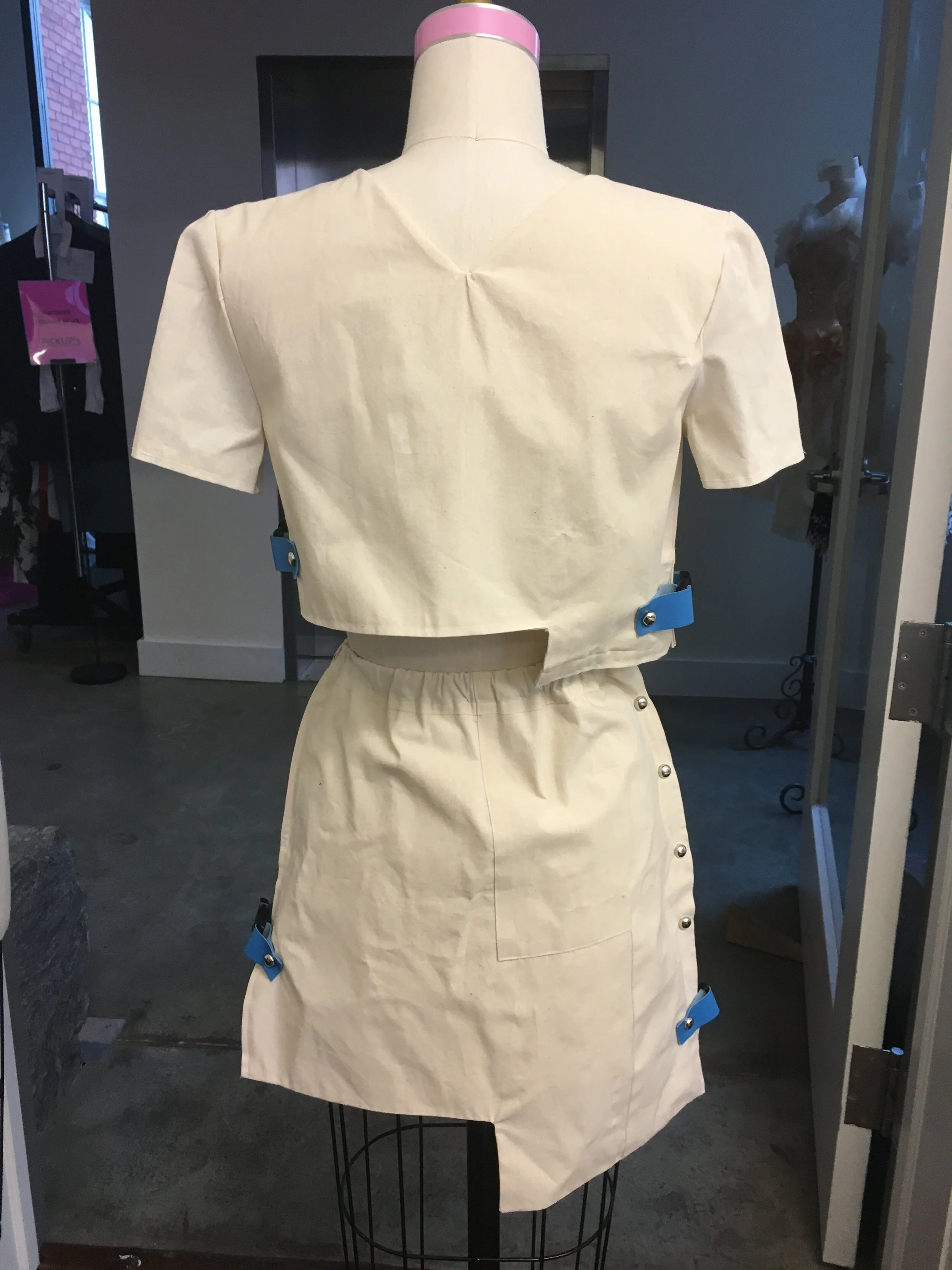This collection was made through making and altering patterns, and splitting each piece into various shaped sections. I used hard angles to imitate metal and classic robotic shapes. The garments were put together by layering the different sections/materials on top of each other, and then attaching them together with topstitching.